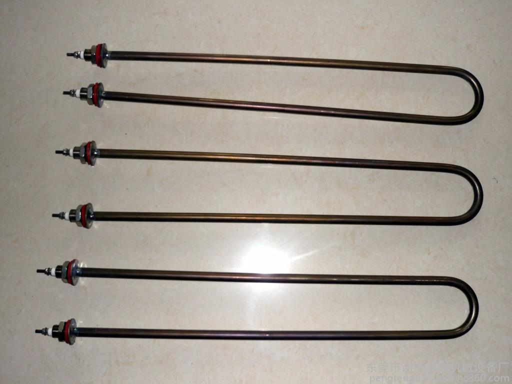 U型電熱管是在無(wú)縫金屬管(碳鋼管、鈦管、不銹鋼管、銅管)內(nèi)放入電熱絲,并在空隙部分緊密地填充有良好的導(dǎo)熱性和絕緣性的結(jié)晶氧化鎂,電熱絲兩端是通過(guò)兩個(gè)引出棒與電源相接,空隙部分填滿有良好導(dǎo)熱性和絕緣性的氧化鎂粉后縮管而成,因電熱管彎曲像因?yàn)橛⑽淖帜窾所以稱為u型電熱管。